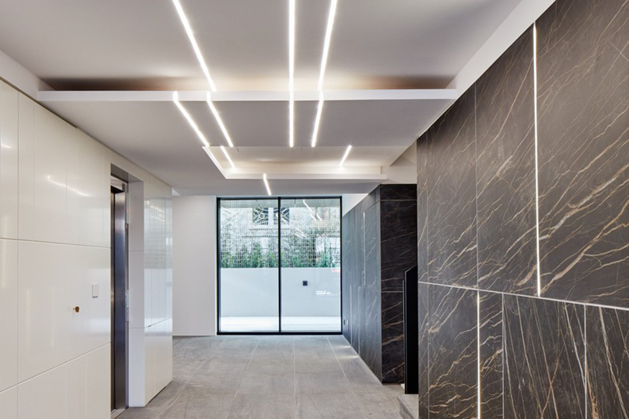 Al piano terra ci sono tre autorimesse, un appartamento con giardino privato e l’ingresso condominiale.