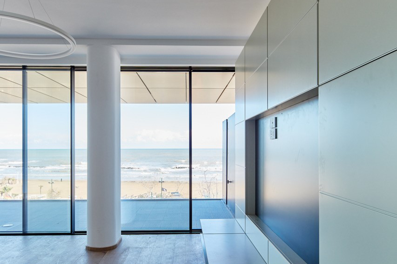 I piani residenziali sono suddivisi secondo varie tipologie abitative in dodici appartamenti che si distribuiscono ortogonalmente alla riviera per godere appieno del fantastico affaccio sul mare.